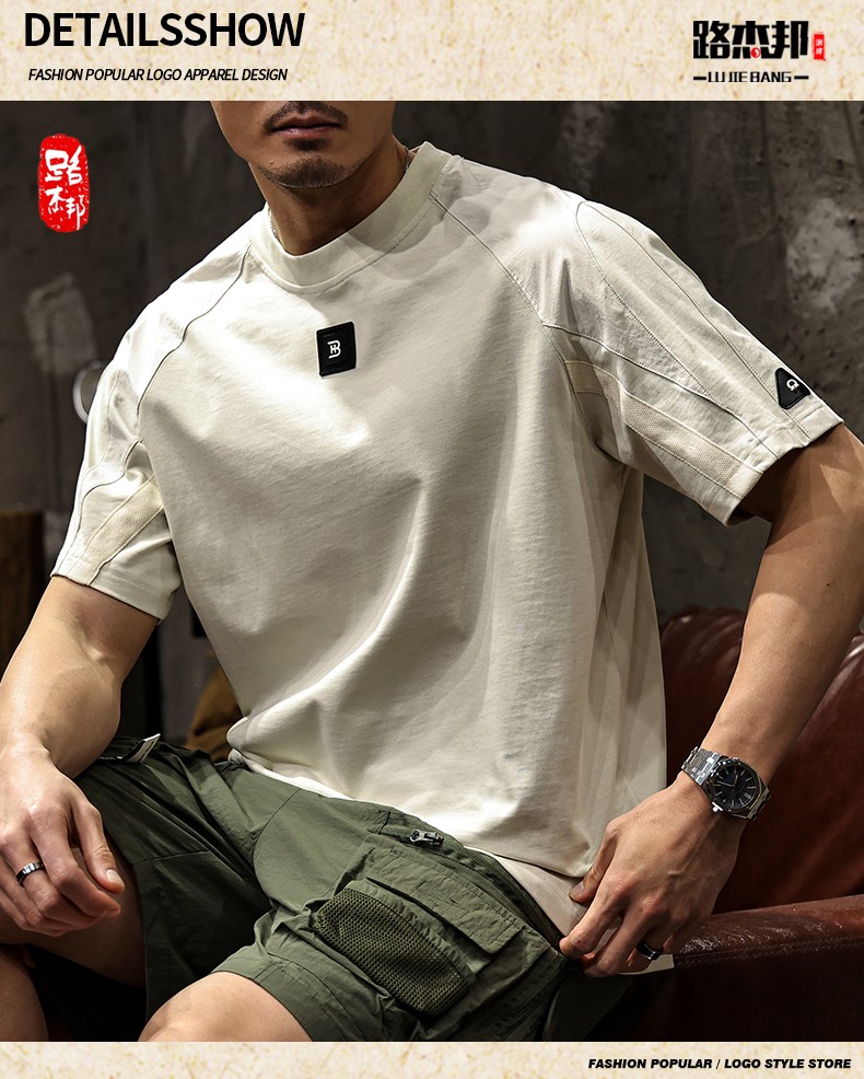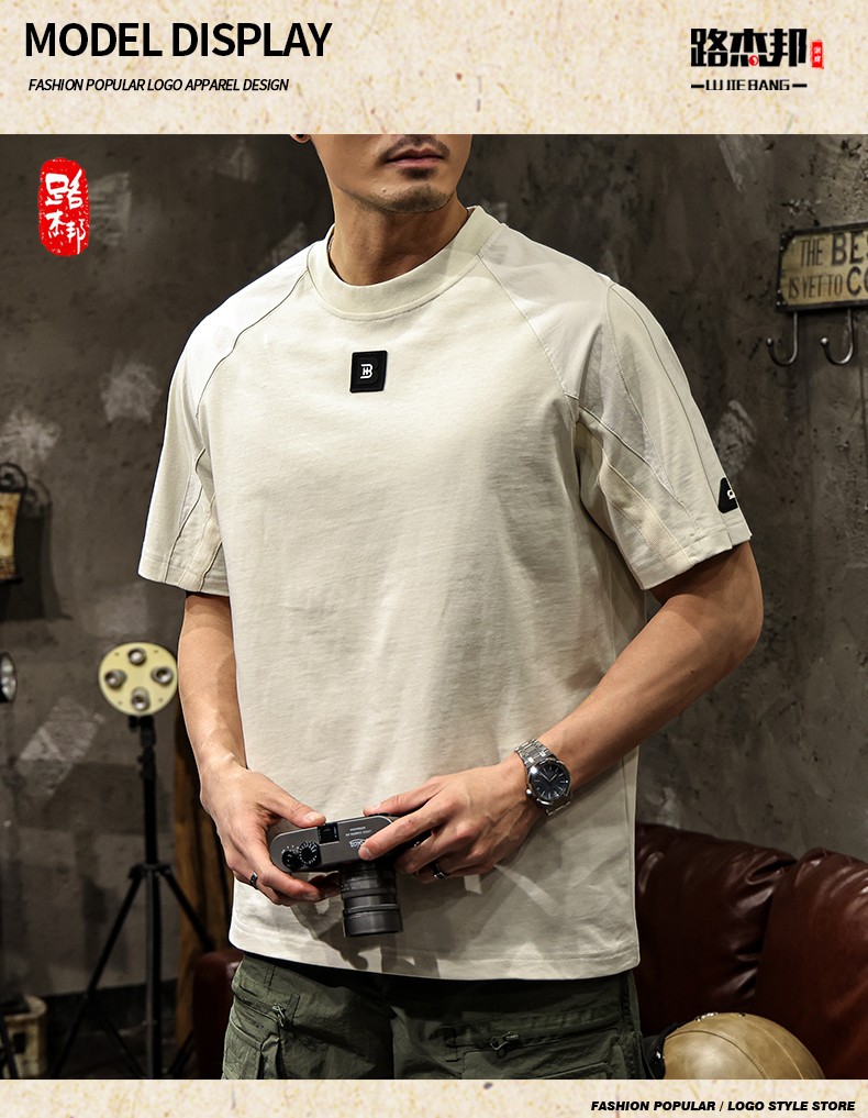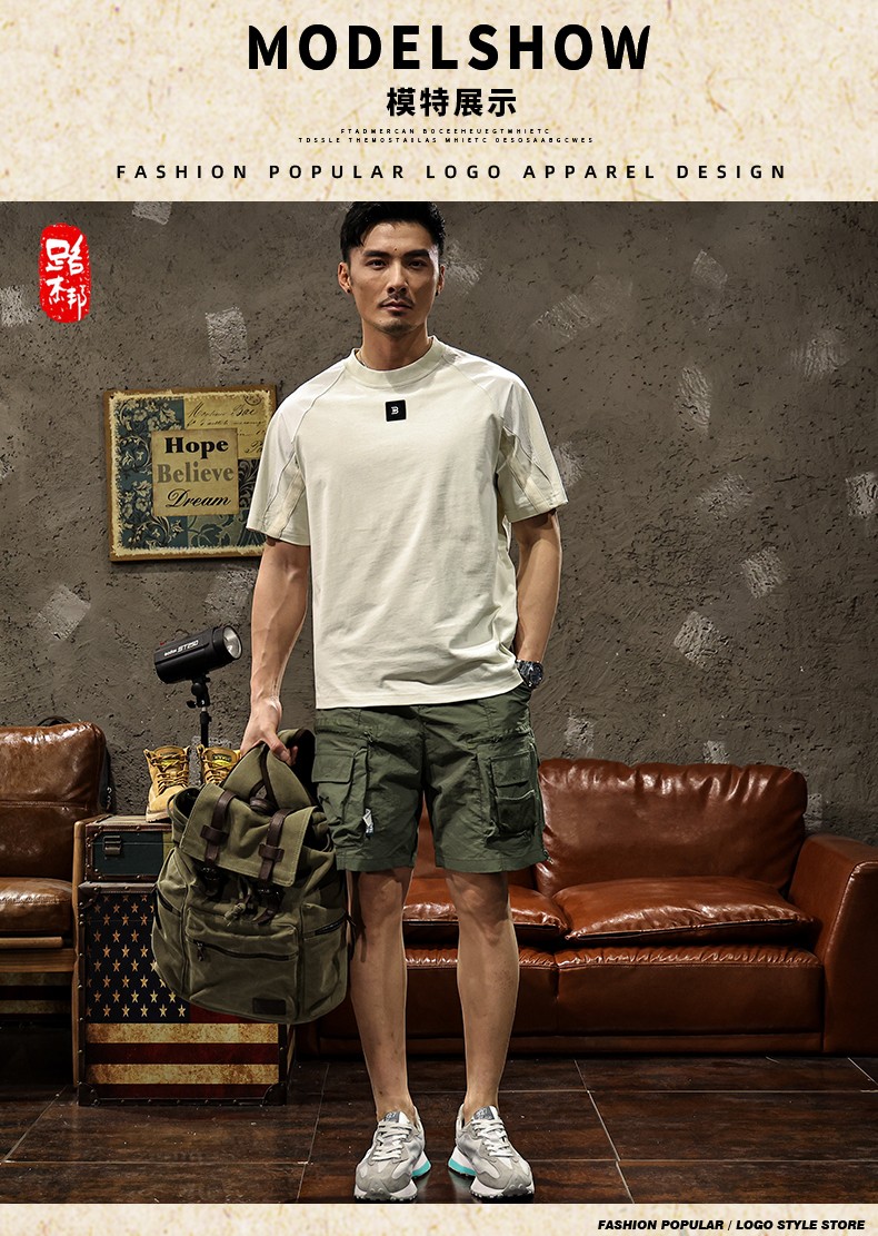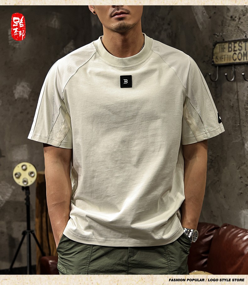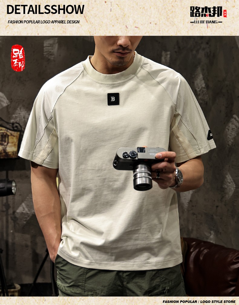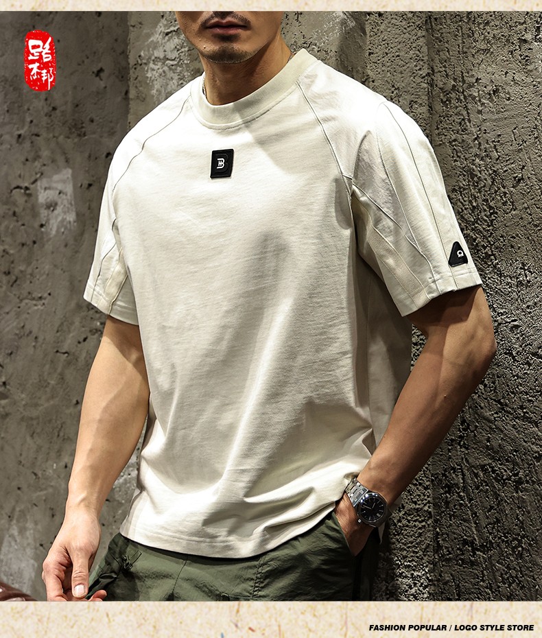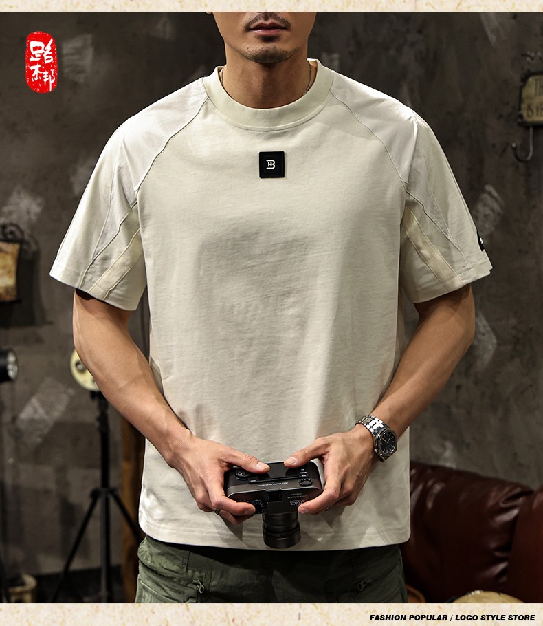 高级感拼接短袖T恤男夏季新款美式潮牌户外宽松圆领印花纯棉体恤