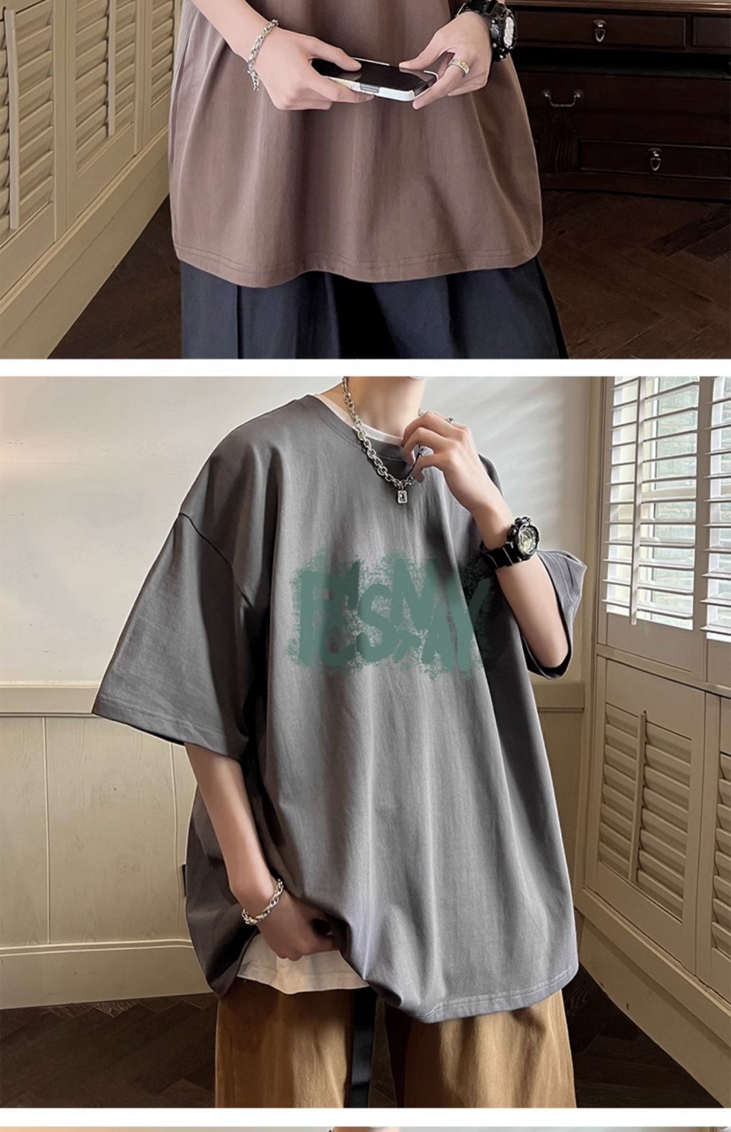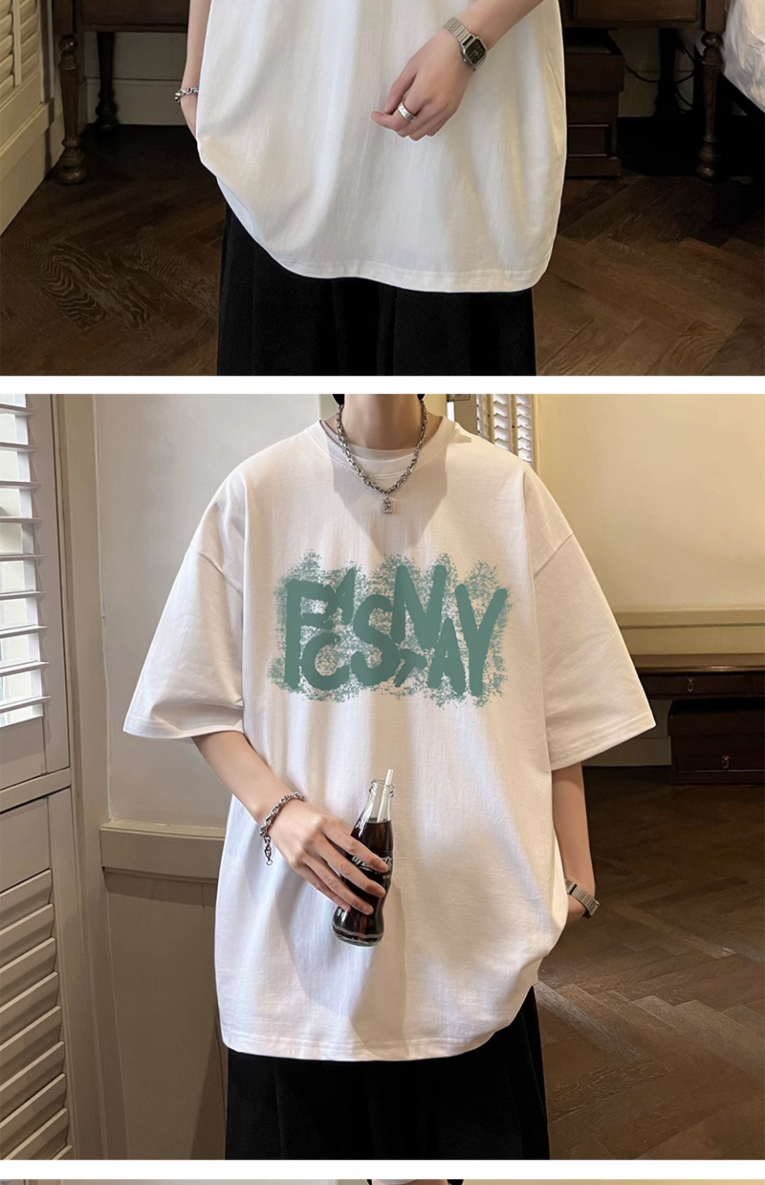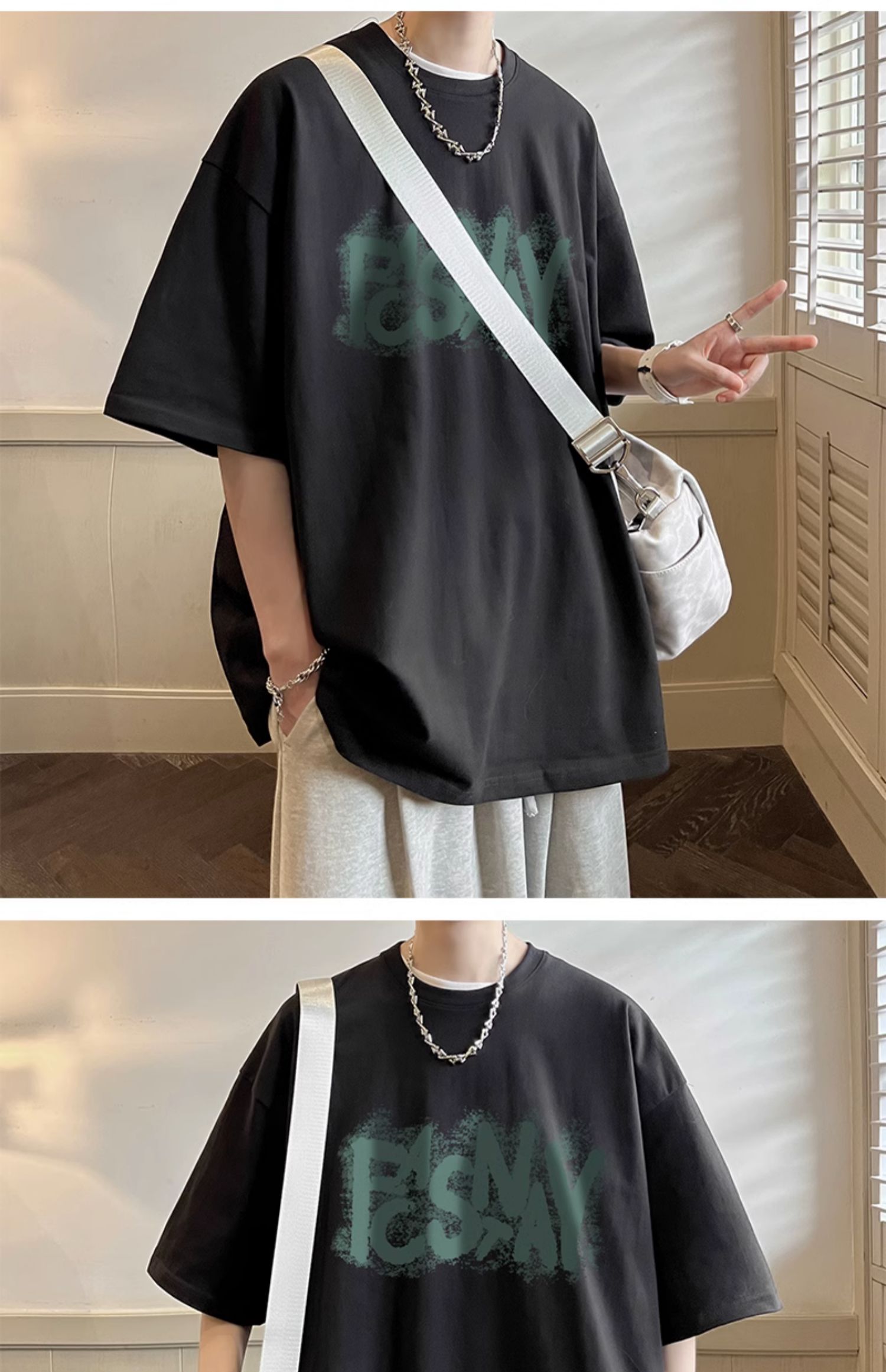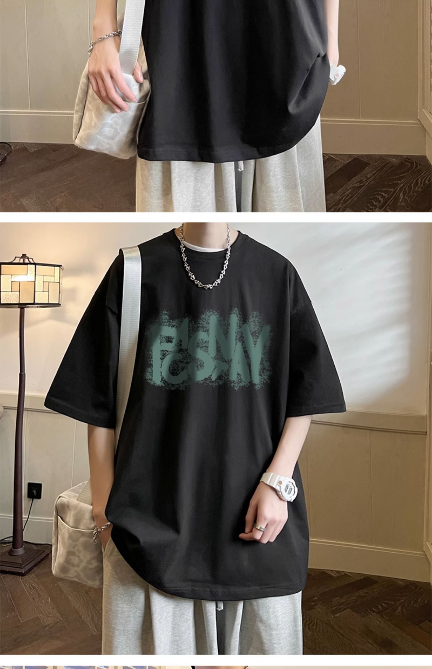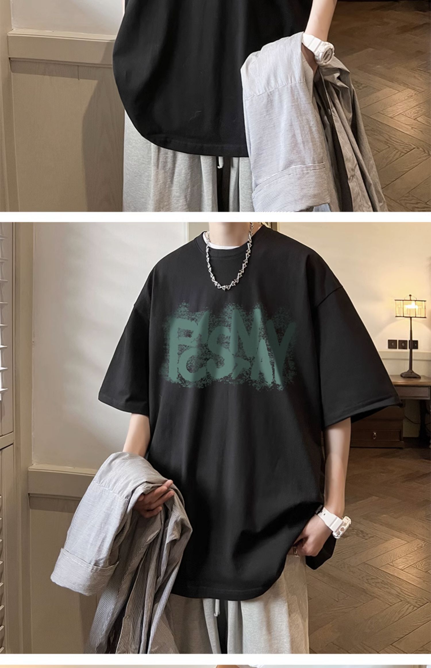 式宽松短袖T恤男重磅潮流印花夏季上衣体恤休闲落肩半袖男衣服...