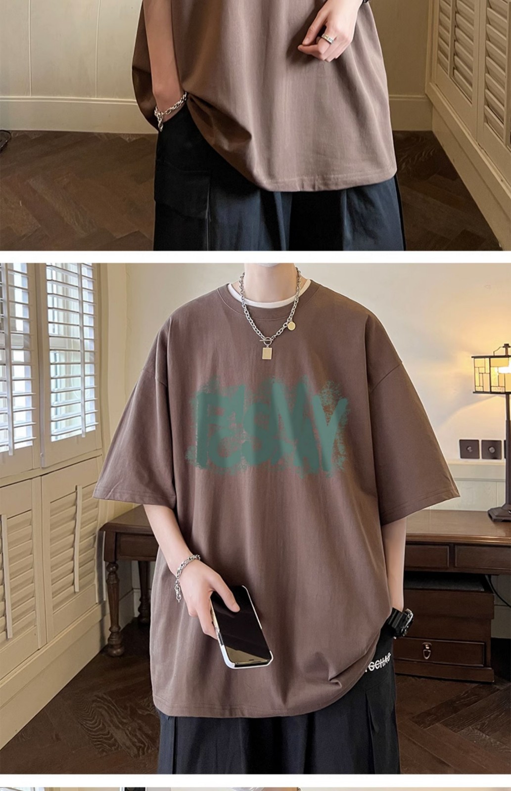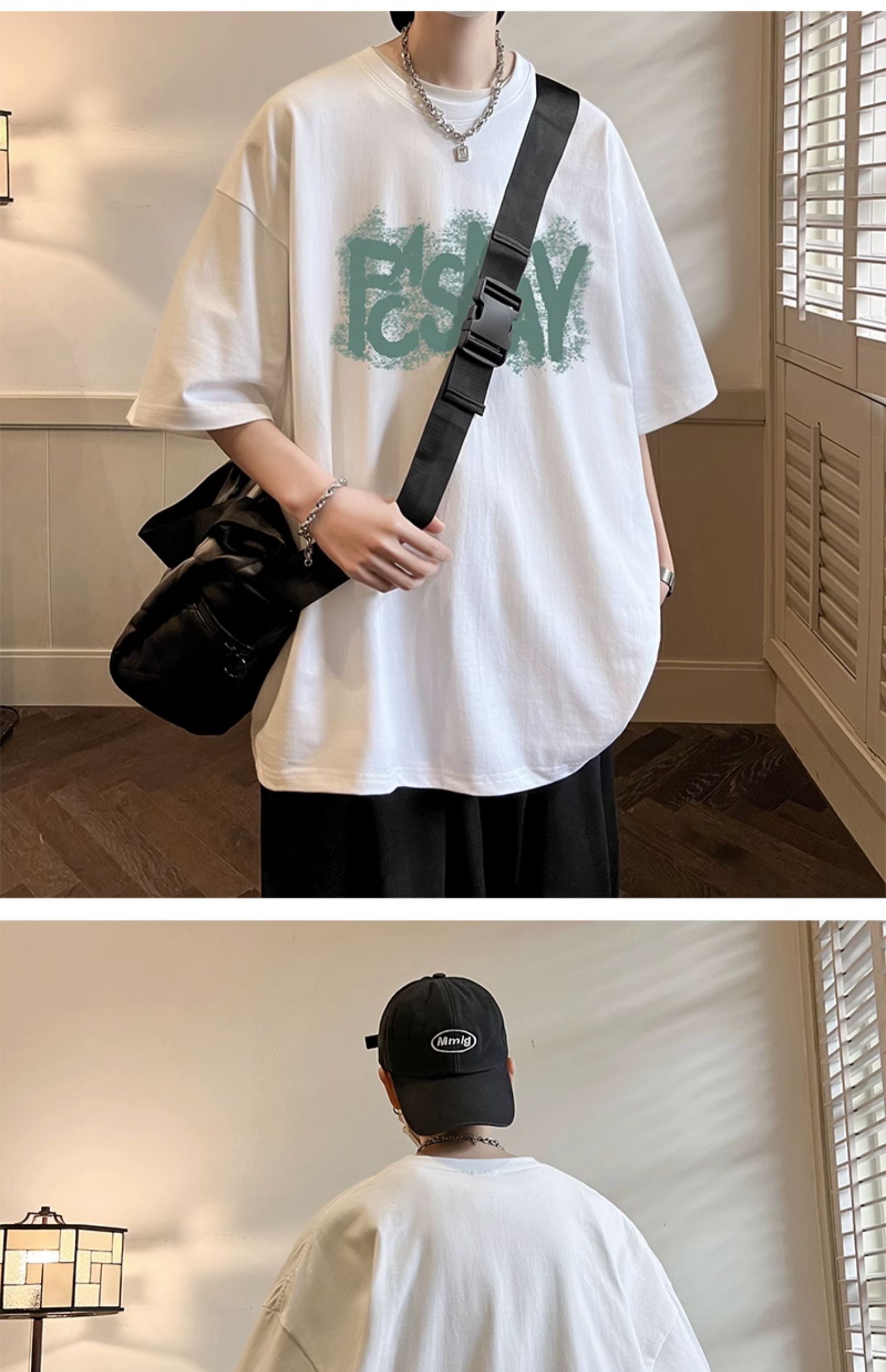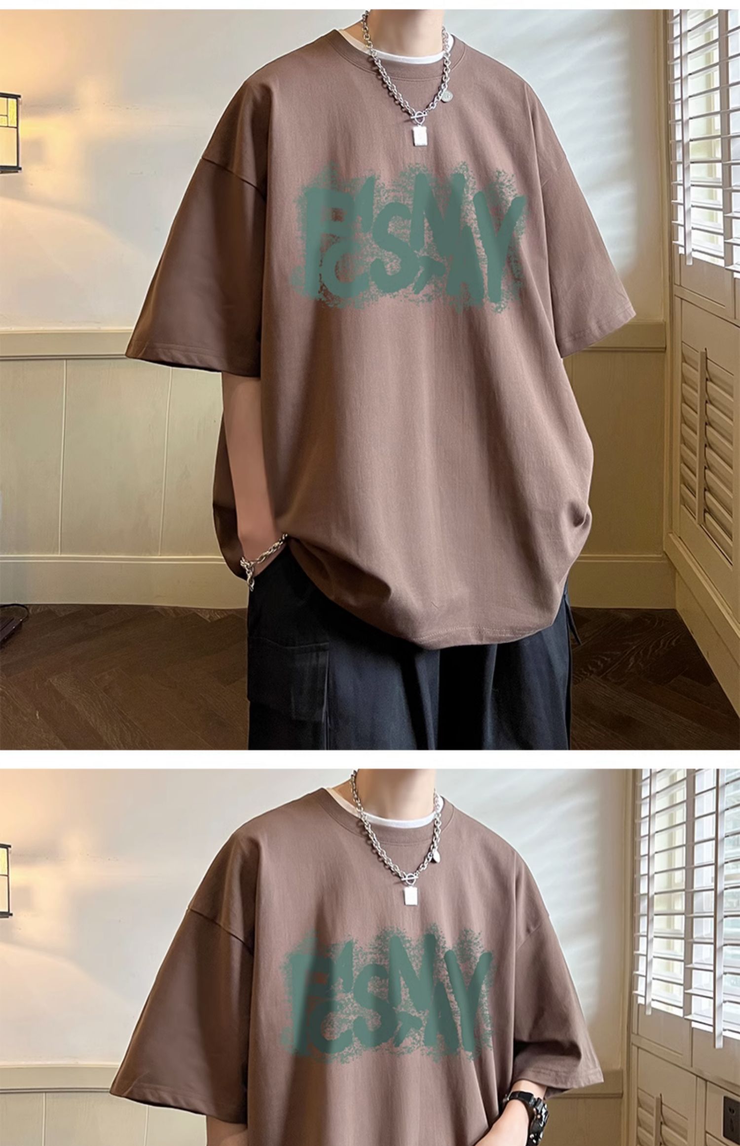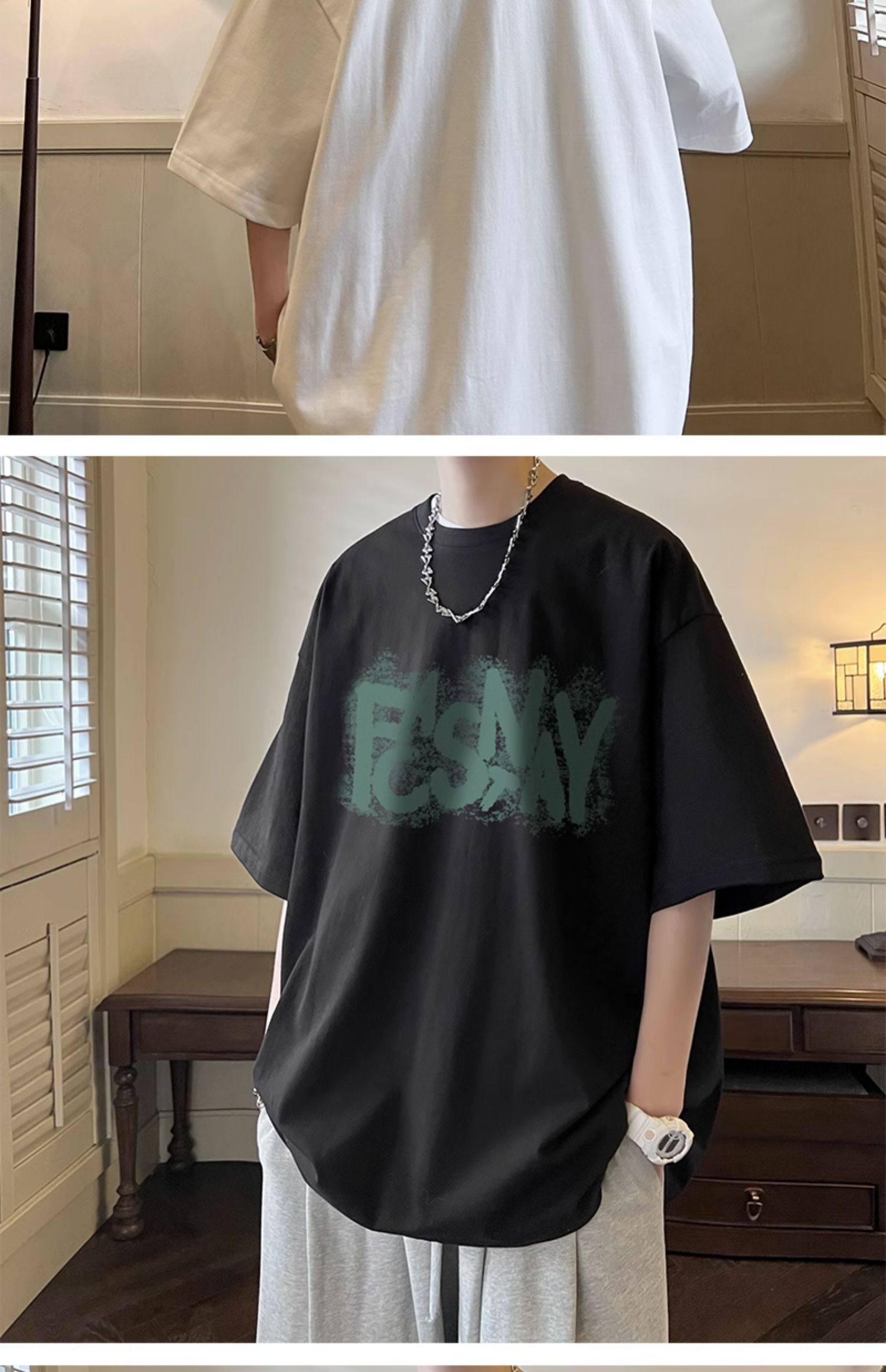式宽松短袖T恤男重磅潮流印花夏季上衣体恤休闲落肩半袖男衣服...
