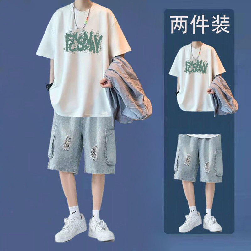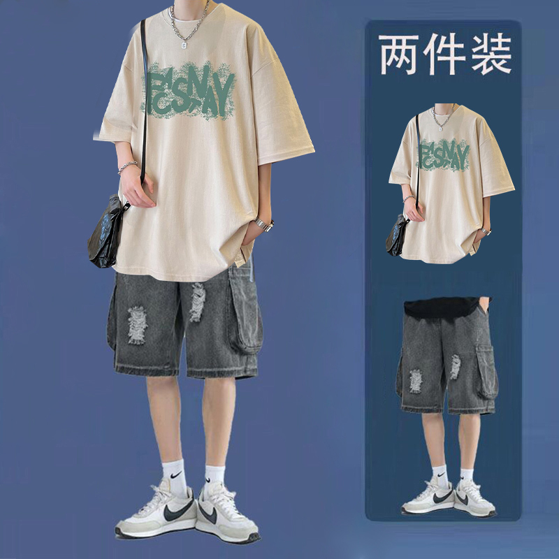 潮牌短袖T恤男纯棉夏季薄款短裤套装两件装冰丝宽松休闲男装穿搭